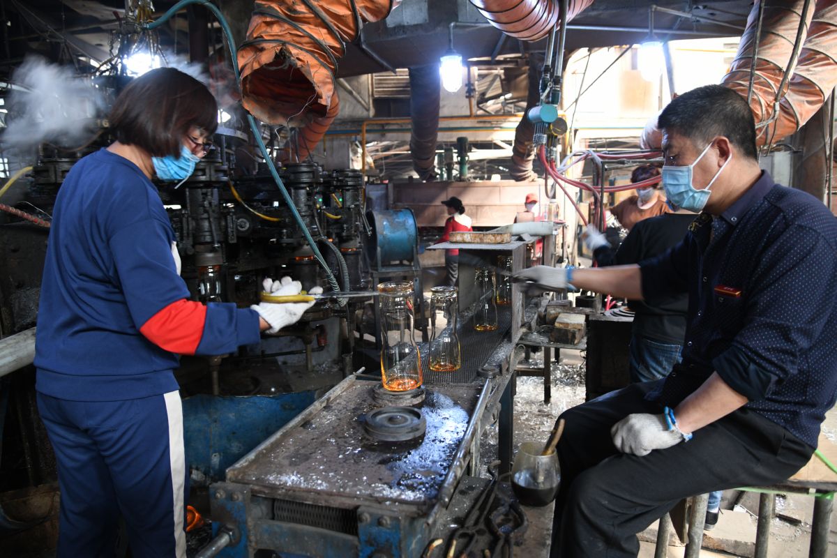 4月9日,聞喜縣華森玻璃制品有限公司機(jī)員工在生產(chǎn)玻璃器皿。