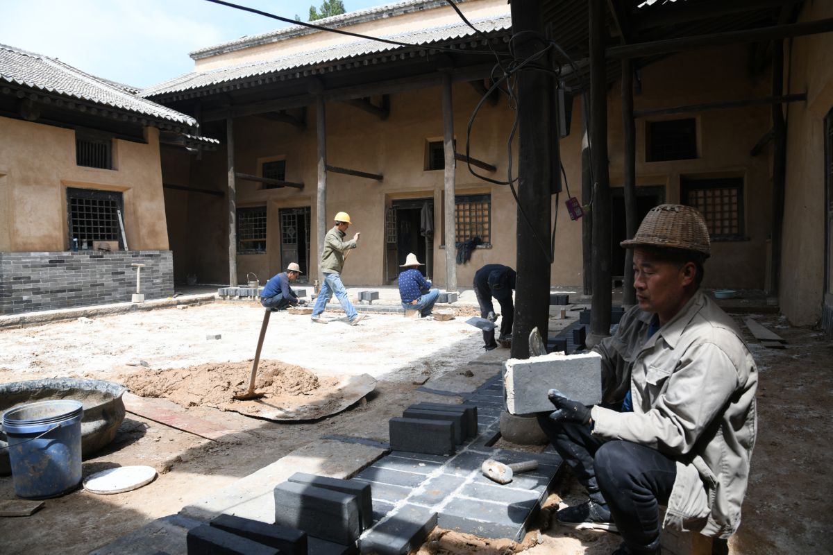 4月21日,古建筑工人在聞喜縣郭家莊鎮(zhèn)陳家莊革命老區(qū)太岳三地委晉南報社舊址保護修繕工程建設工地施工。