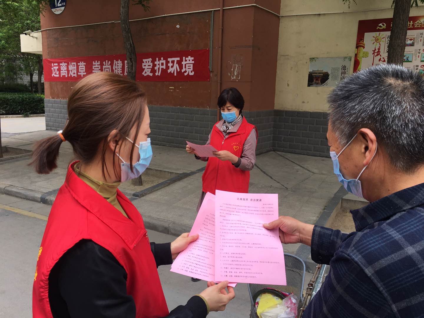 社區(qū)工作人員向居民發(fā)放禁煙控?zé)熜麄髻Y料 劉凱華 攝