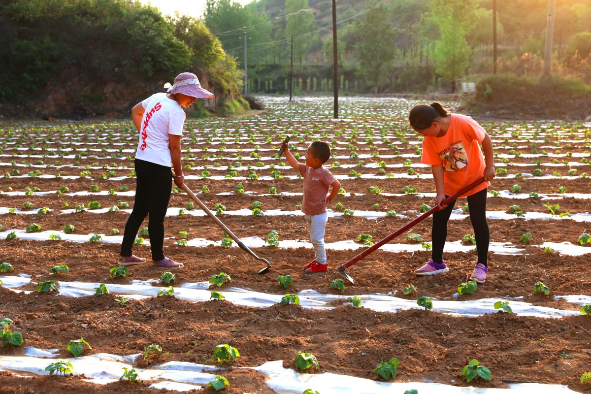 5月2日,夏縣瑤峰鎮郭家河村村民在豆角田里鋤草。