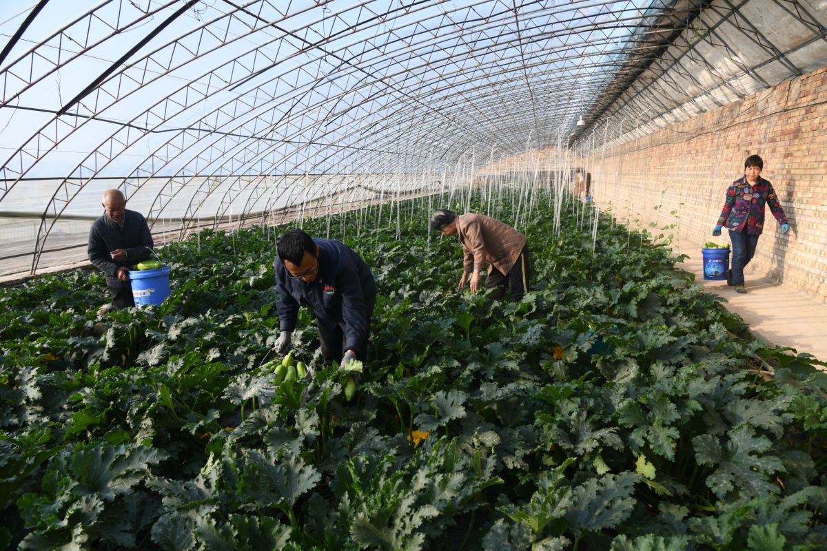 5月5日,聞喜縣桐城鎮下邱村口福專業合作社社員在采摘西葫蘆。