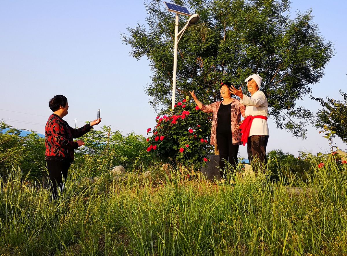 當日,附近村莊的農民帶著演出服裝,結伴到鳥語花香的公園,拍攝歌頌黨、歌頌祖國、贊美新時代的抖音段子,發到網上傳播社會正能量。 特約攝影 李克榮
