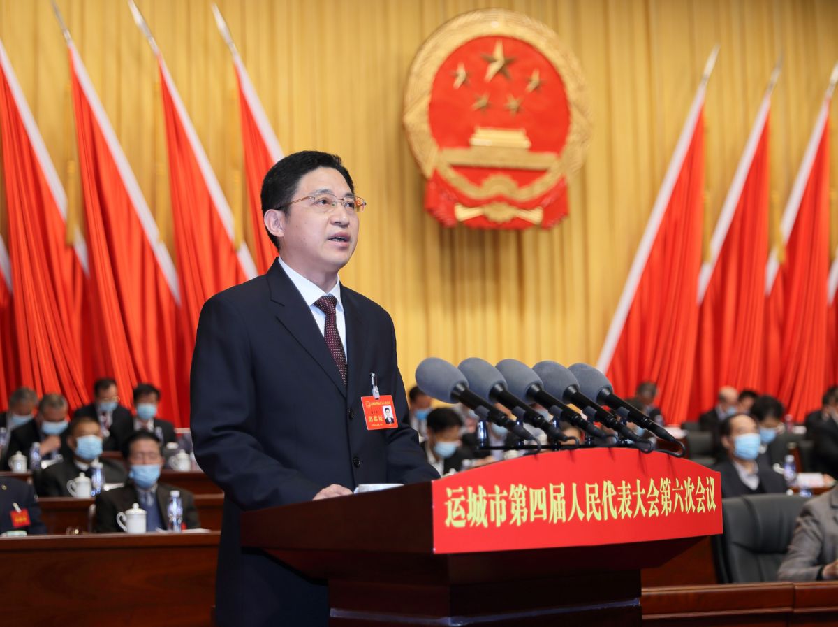 4月27日,在運(yùn)城市第四屆人民代表大會(huì)第六次會(huì)議上,儲(chǔ)祥好作政府工作報(bào)告。 記者 閆 鑫 攝