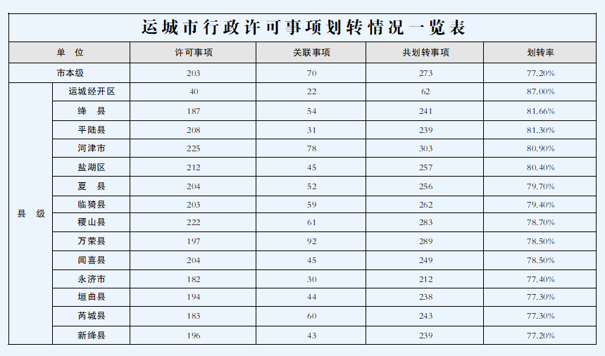 按照“宜劃則劃”“應劃盡劃”的原則,堅持以劃轉為原則,不劃轉為例外,市本級首批劃轉涉改單位24家、劃轉事項273項,其中行政許可事項203項、關聯事項70項,集中度達到77.2%;各縣(市、區)和運城經濟技術開發區集中度平均達到79.7%,完成省定目標任務。