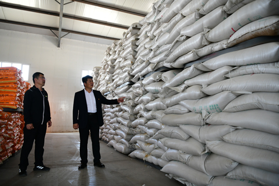 飼料加工廠內張繼新問詢工作人員飼料儲備情況。(陳立庚攝)