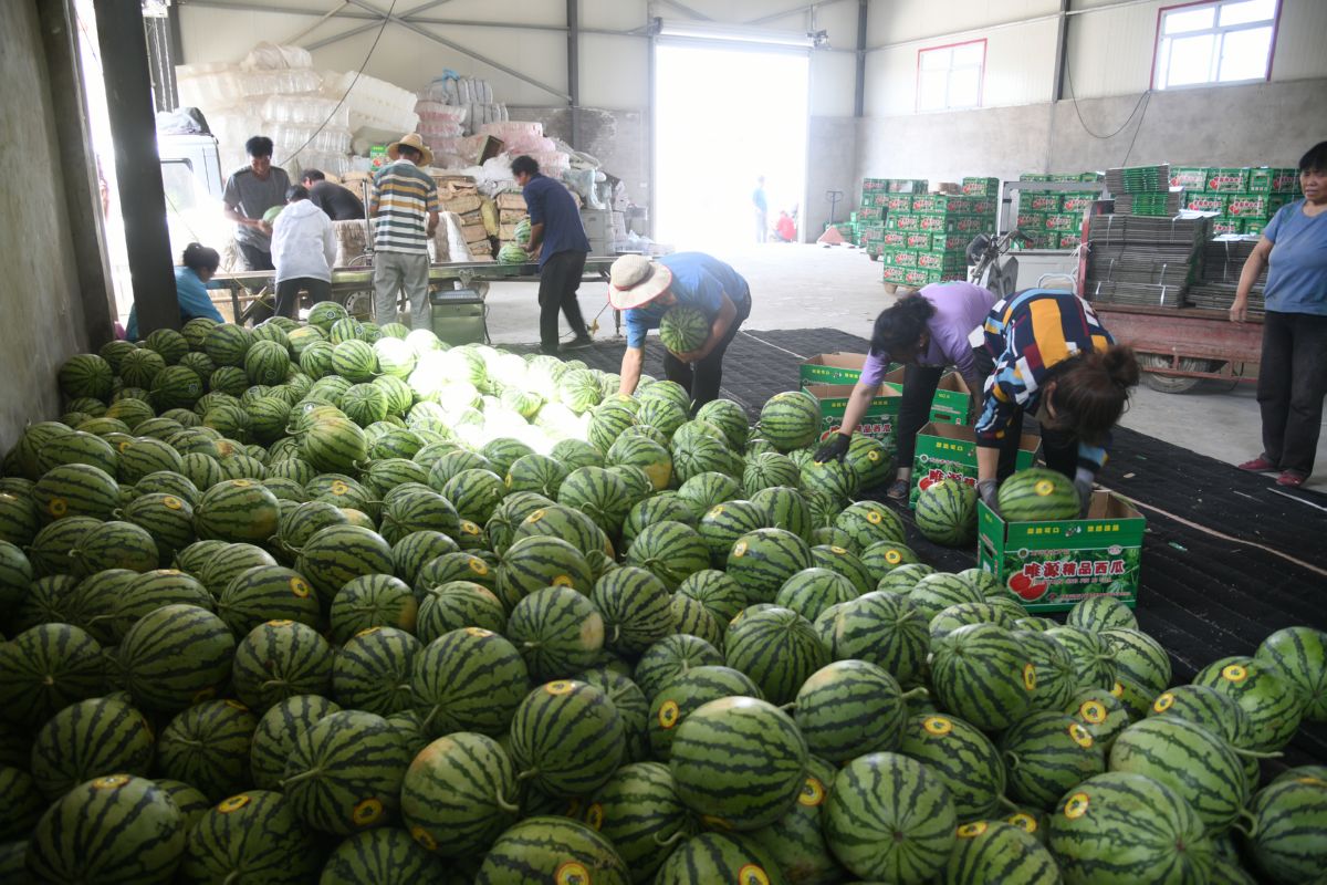 6月2日,聞喜縣郭家莊鎮西阜村唯源西瓜種植專業合作社社員在為西瓜裝箱,準備發往市場。