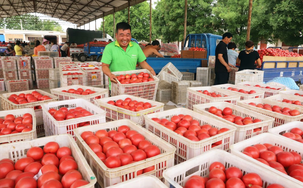 6月2日,夏縣廟前鎮楊村村民在將新采摘的西紅柿分選入筐,準備發往市場。