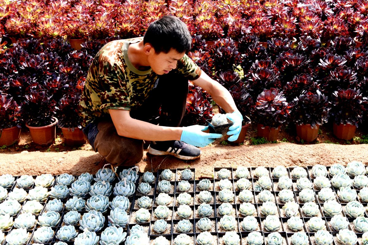 楊洋3年前辭去在銀行的工作回家鄉創業,到農村承包大棚栽培多肉植物。今年,他又聯系了4位朋友建起了14個多肉大棚產業基地,多肉植物品種達百余種,產品銷往北京、上海等大城市,取得了可觀的經濟效益。