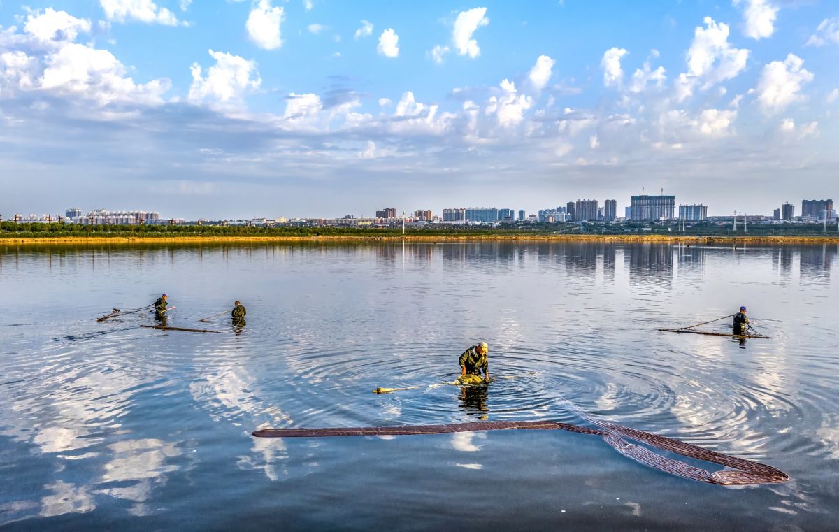 工作人員在鹽湖中捕撈鹵水蟲 記者 薛 俊 攝