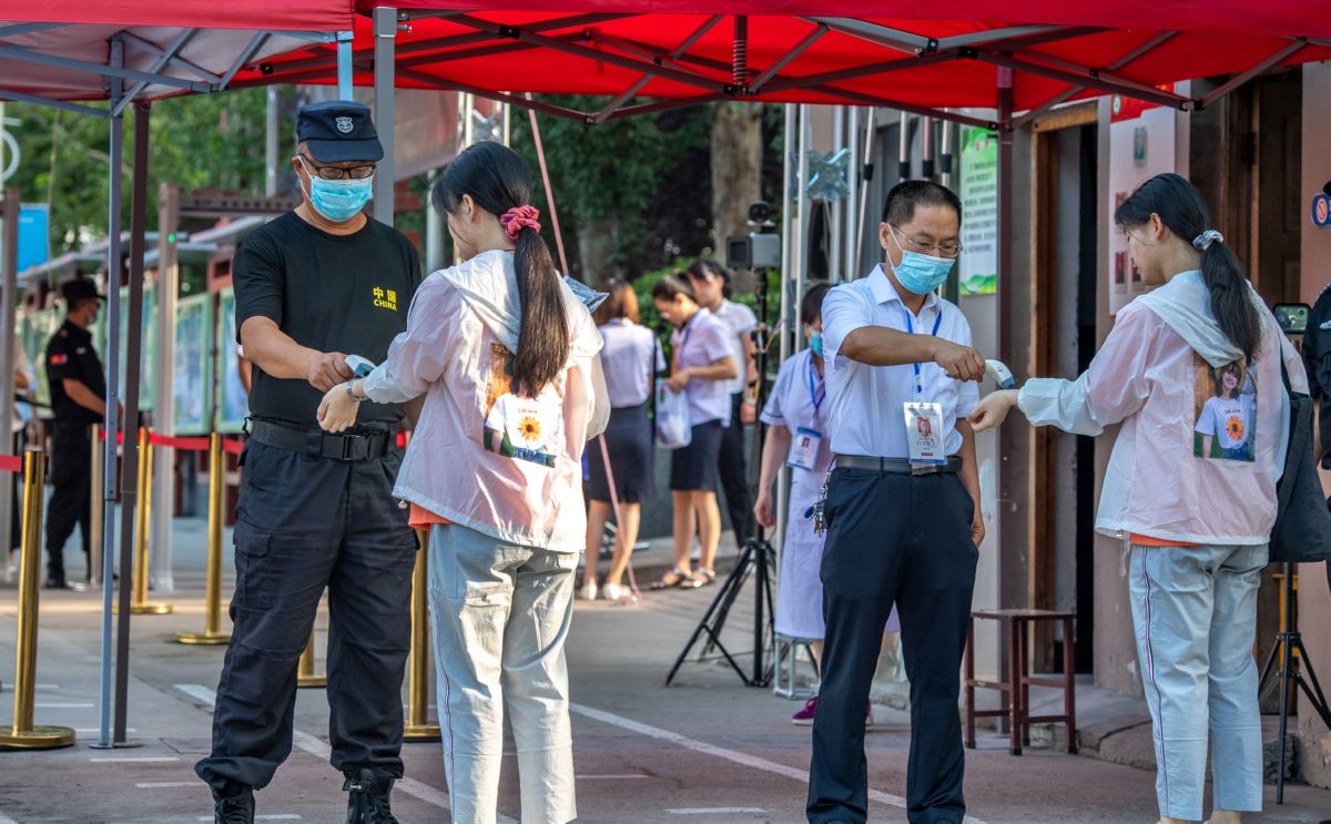 7月7日,在市區運城中學考點,考生接受人臉識別系統體溫測量后,有序進入考場。 特約攝影 尚建周
