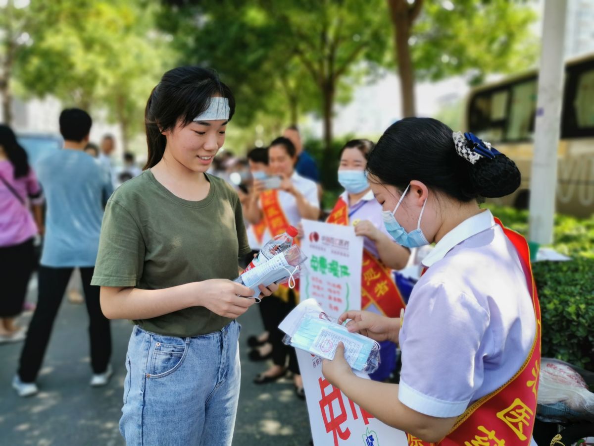 ▲7月7日,在運城力行中學門口,華強百匯醫藥公司的愛心護考志愿者,為考生發放口罩。