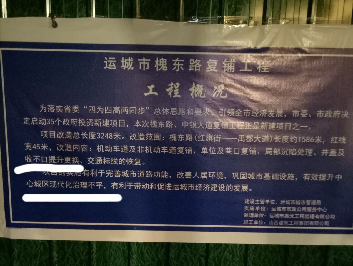 ▲7月7日晚,記者在市區河東街與槐東路交會處的“運城市槐東路復鋪工程”公告上,看到有兩處語句不通。
