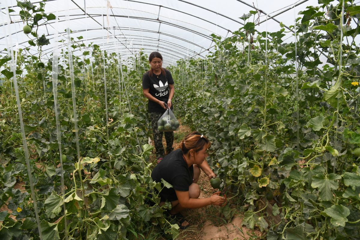 7月9日,村民在聞喜縣陽(yáng)隅鄉(xiāng)回坑村青年農(nóng)民高瑞琳的大棚采摘園內(nèi)采摘甜瓜。