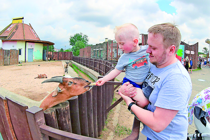 ?6月28日,在白俄羅斯明斯克動物園,一對父子給山羊喂食。