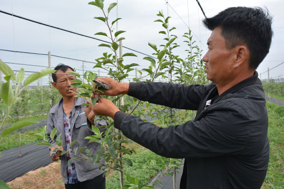 7月14日,工作人員在國家現代蘋果產業(東卓)示范基地內對果樹進行摘心作業。