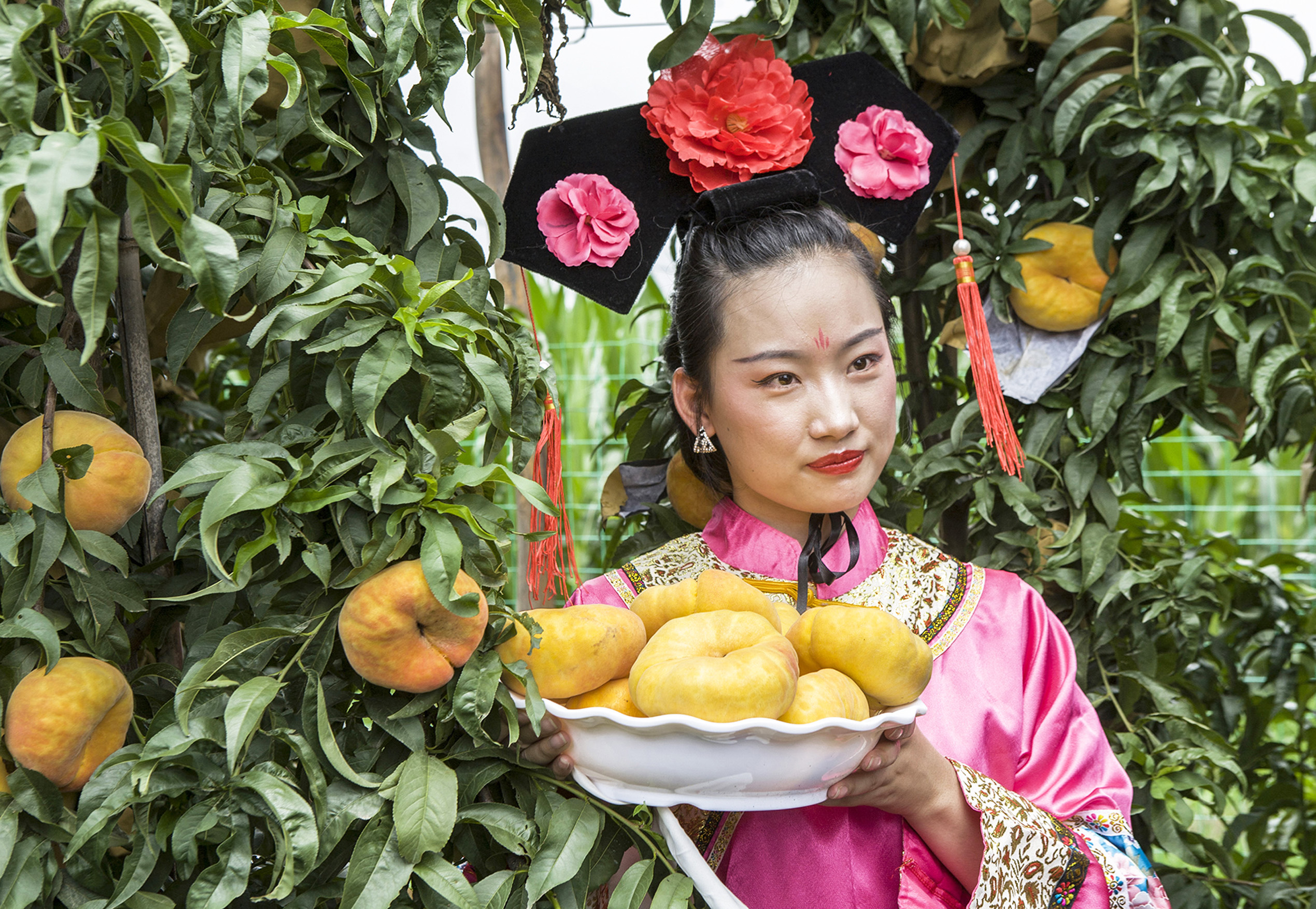徜徉在千畝桃園,一個個黃中泛紅的蟠桃掛滿枝頭,在青翠桃葉的映襯下顯得分外誘人。桃農(nóng)及游客提籃拎袋,三五成群,小心翼翼地采摘那掛滿枝頭、壓彎樹枝的蟠桃。不時有“仙女”裝扮的少女端著一盤蟠桃從身邊走過,讓人頓感恍若隔世,不由地發(fā)出“昔日仙境圣果,今上百姓餐桌”的感嘆。