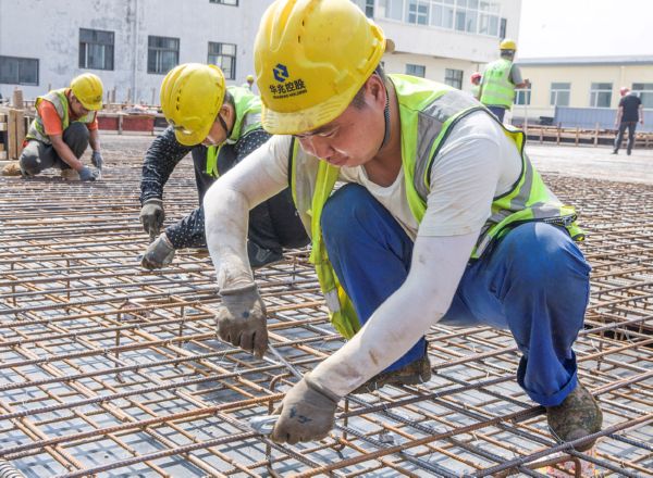 8月2日,在萬榮縣中醫醫院住院樓建設工地,工人們冒著酷暑綁扎鋼筋。
