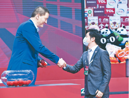 ▲8月10日,抽簽嘉賓巴特爾(左)和獲得第一順位的上海久事隊代表握手。 當日,2020年CBA選秀樂透抽簽儀式在山東青島舉行。上海久事隊獲得第一順位選秀權,時代中國廣州隊和天津先行者隊分別獲得第二和第三順位。 新華社發