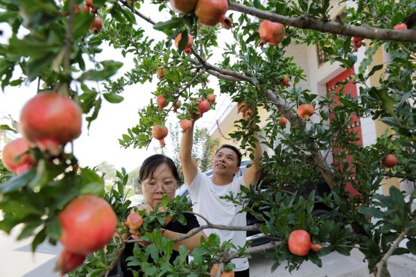 8月10日,夏縣瑤峰鎮樊家峪村村民在自家門前查看石榴病蟲害防治情況。