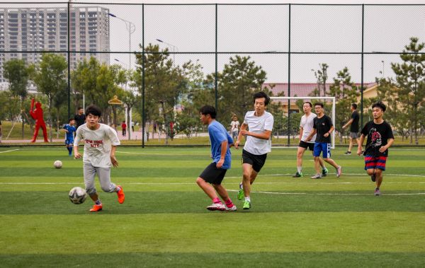 ▲8月12日下午,市民在市體育公園足球場踢足球。 記者 金玉敏 攝