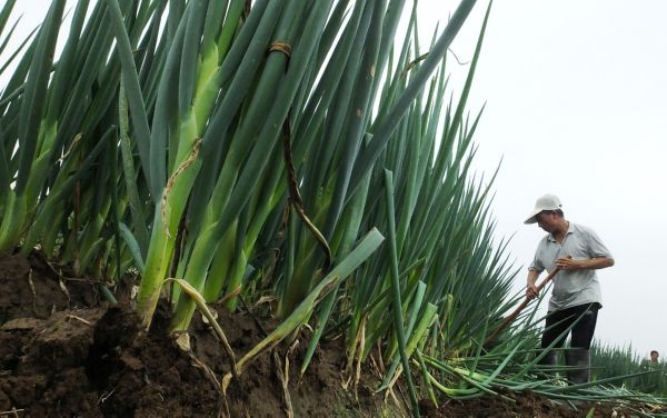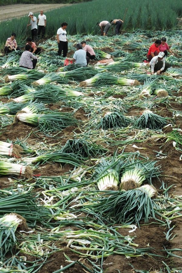 ▲近日,在新絳縣古交鎮北王馬村,菜農搶收豐收的大蔥。