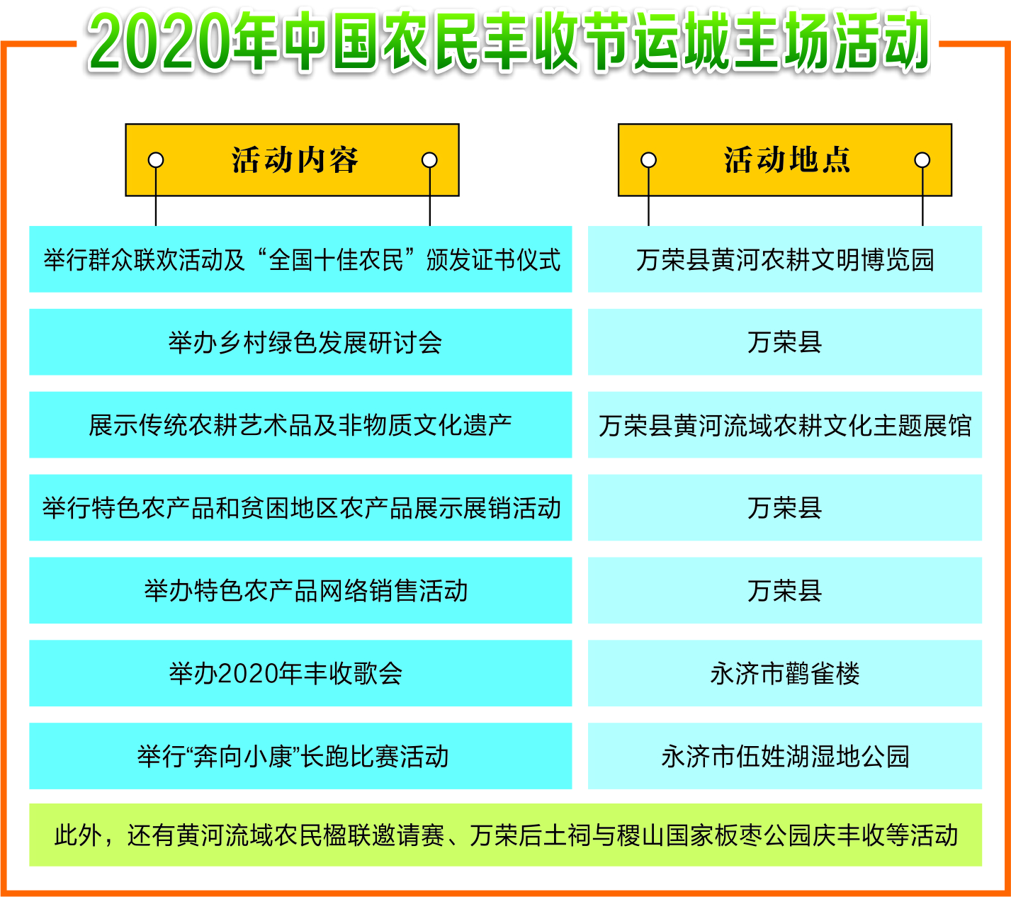 王 成:在決戰(zhàn)決勝脫貧攻堅(jiān)、全面建成小康社會(huì)收官之年,農(nóng)民豐收節(jié)主場(chǎng)活動(dòng)“走進(jìn)山西”,山西省委省政府高度重視,樓陽(yáng)生書(shū)記、林武省長(zhǎng)多次作出批示,提出具體要求,目前各項(xiàng)籌備工作進(jìn)展順利。運(yùn)城古稱“河?xùn)|”,地處晉陜?cè)S河金三角區(qū)域中心,是華夏農(nóng)耕文明的源頭,運(yùn)城主場(chǎng)將舉辦“慶豐收、迎小康”系列活動(dòng),以慶祝豐收、弘揚(yáng)文化、振興鄉(xiāng)村為基調(diào),突出主題、簡(jiǎn)樸隆重、安全高效、力求完美,多形態(tài)、立體式展現(xiàn)中國(guó)悠久燦爛的農(nóng)耕文明、豐富多彩的豐收美景和廣大農(nóng)民的時(shí)代風(fēng)采。主場(chǎng)活動(dòng)共有七項(xiàng):一是在萬(wàn)榮縣黃河農(nóng)耕文明博覽園舉行群眾聯(lián)歡活動(dòng)及“全國(guó)十佳農(nóng)民”頒發(fā)證書(shū)儀式。二是在萬(wàn)榮縣舉辦鄉(xiāng)村綠色發(fā)展研討會(huì)。三是在萬(wàn)榮縣黃河流域農(nóng)耕文化主題展館展示目前傳統(tǒng)農(nóng)耕藝術(shù)品及非物質(zhì)文化遺產(chǎn)。四是在萬(wàn)榮縣舉行特色農(nóng)產(chǎn)品和貧困地區(qū)農(nóng)產(chǎn)品展示展銷活動(dòng)。五是在萬(wàn)榮縣舉辦特色農(nóng)產(chǎn)品網(wǎng)絡(luò)銷售活動(dòng)。六是在永濟(jì)市鸛雀樓舉辦2020年豐收歌會(huì)。七是在永濟(jì)市伍姓湖濕地公園舉行“奔向小康”長(zhǎng)跑比賽活動(dòng)。此外,還有黃河流域農(nóng)民楹聯(lián)邀請(qǐng)賽、萬(wàn)榮后土祠與稷山國(guó)家板棗公園慶豐收等活動(dòng)。辦好農(nóng)民豐收節(jié)主場(chǎng)活動(dòng)是山西的一件大事、要事、喜事,我們有信心、有決心、有能力辦出特色,辦出水平。我們將在中國(guó)農(nóng)民豐收節(jié)組織指導(dǎo)委員會(huì)的指導(dǎo)下,緊密聯(lián)動(dòng),精心準(zhǔn)備,確保主場(chǎng)活動(dòng)圓滿成功,為廣大農(nóng)民提供一場(chǎng)耳目一新、豐富多彩、歡快喜慶的節(jié)日盛宴。