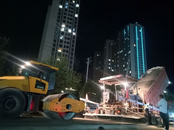 ▲8月25日晚,在市區解放路天逸公園附近,施工單位連夜加班鋪設水穩層。 祁克寧 攝