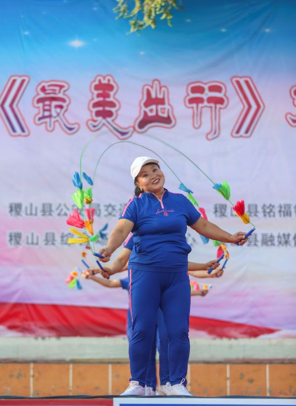 8月27日,參賽選手在稷山縣民樂園文化廣場的舞臺上,表演交通安全宣傳廣場舞“最美出行”。當天,稷山縣“最美出行”交通安全廣場舞大賽,在該縣民樂園文化廣場舉行,來自該縣各鄉、鎮、街道辦的13支參賽隊伍參加了比賽。