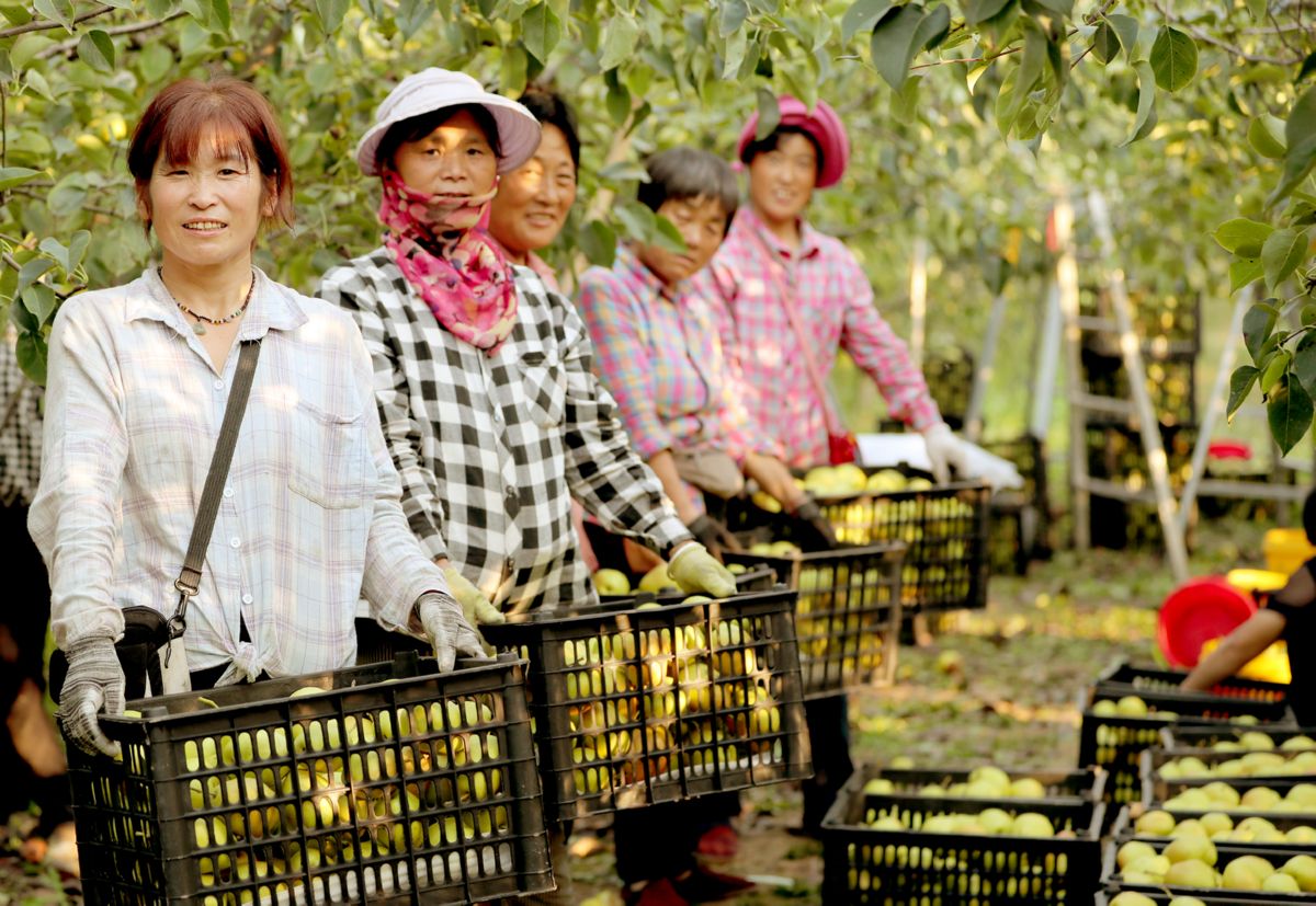 ▲泓芝驛鎮(zhèn)張?jiān)来宓睦鎴@,人們忙著摘梨。