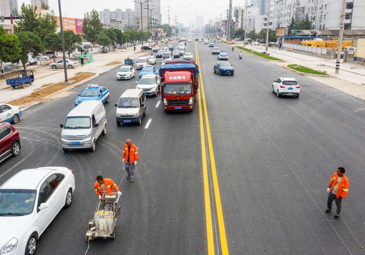 ▲施工人員在機場大道劃設道路標線