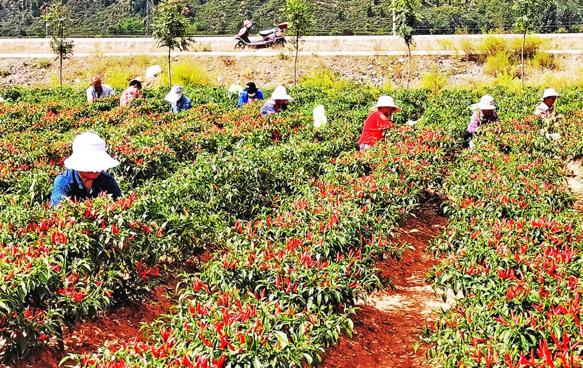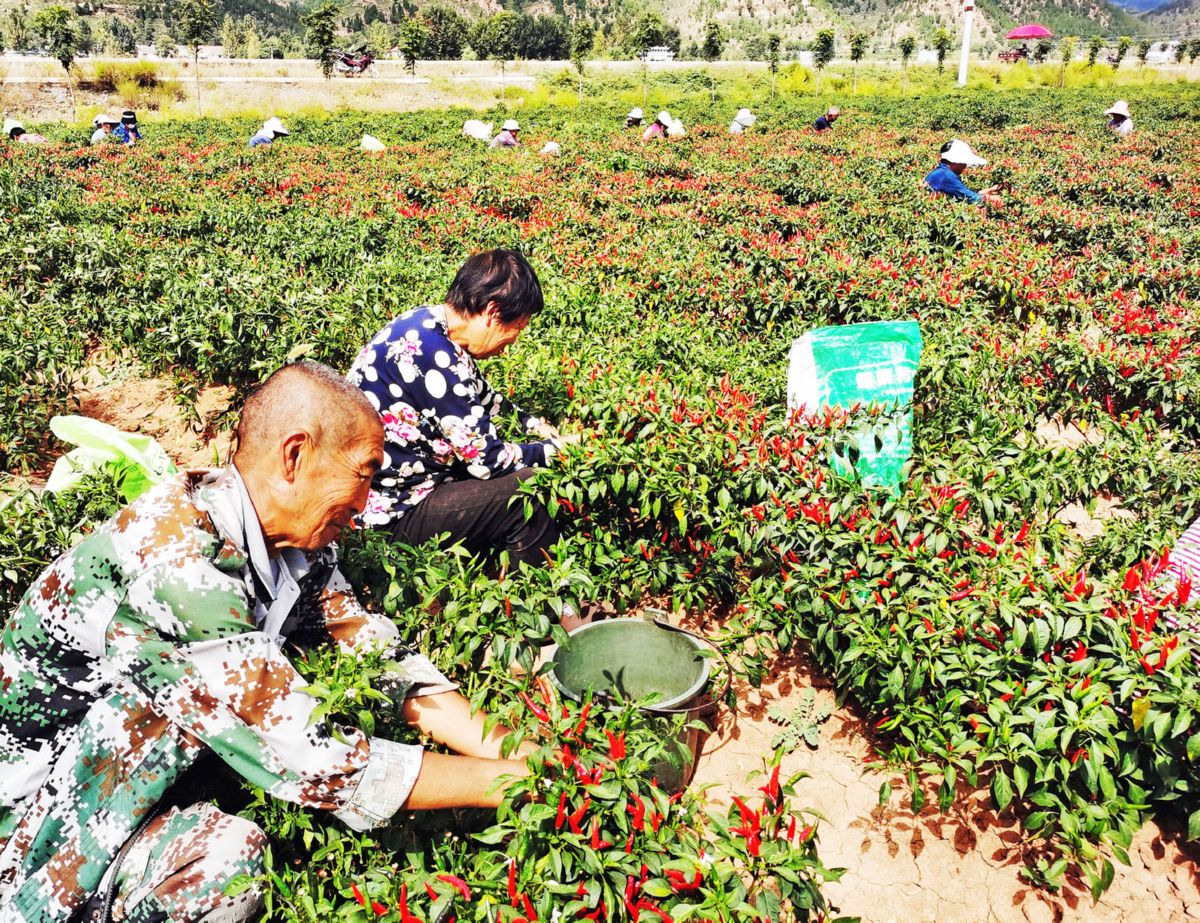 ▲金秋時節,垣曲縣歷山鎮河西村許多農民忙著在高磊種植合作社辣椒基地采摘辣椒。