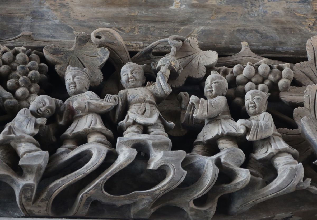 祠內的戲臺由“前一后二”三座戲臺前后聯綴布列,形成“品”字形格局,為全國孤例,至為珍貴。從聲學原理來看,三座戲臺距離很近,如果處理不好音響效果,就會互相影響。當年在建造“品”字形戲臺時,充分考慮了聲音的直射、反射等聲學原理,我們不能不佩服前人的智慧。“品”字形戲臺的前面一個戲臺,俗稱過路戲臺,平時是山門,唱戲時在高處放上木板,就成為戲臺。每逢廟會,臺上唱戲,臺下走人。戲臺的對聯頗有意思,上聯:游哉悠哉,頭上生旦凈丑;下聯:演也艷也,腳下士農工商。來來往往的觀眾悠閑地從戲臺下走過,生旦凈丑等演員在人們頭頂上的戲臺演出。演員穿著華麗的戲服在臺上表演,腳下通道上行走著士農工商各色人等。后面的兩座戲臺,西臺稱為佛家臺。臺前也有對聯,上聯:空即色,色即空,我聞如是;下聯:畫中人,人中畫,于意云何。空和色都是佛家名詞。空指虛,色指實。虛的就是實的,實的就是虛的,我聽說是這么個理。戲臺上的演員就像畫中人,而演員看臺下的觀眾,也像在看一道風景,故稱人中畫。唱戲的人,看戲的人,大家說是不是這么個理?東臺稱為道家臺。上聯:前緩聲,后緩聲,善哉歌也;下聯:大垂手,小垂手,軒乎舞之。緩聲指柔緩的歌聲,垂手是指戲臺上演員的舞蹈動作。臺上唱出來的無論前低音還是后低音,都婉轉美妙。演員的舞蹈動作或像驚鴻,或如飛燕,都婀娜多姿。據說當年東臺唱蒲劇、西臺演秦腔、過亭臺則是豫劇,哪個戲臺的戲好,觀眾便涌到哪一個臺下,也是中國戲劇史上的一個奇觀。