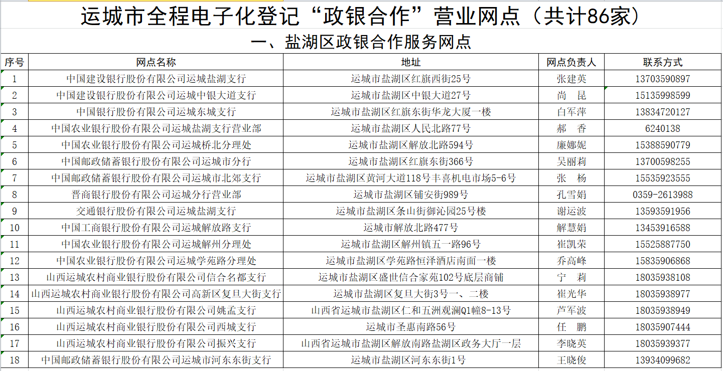 運(yùn)城晚報(bào)訊(記者 祁克寧 通訊員 王盼盼 李建平)10月14日,從市行政審批服務(wù)管理局獲悉,經(jīng)過(guò)前期的業(yè)務(wù)專題培訓(xùn)和系統(tǒng)對(duì)接,目前,全市13個(gè)縣(市、區(qū))和運(yùn)城經(jīng)濟(jì)技術(shù)開(kāi)發(fā)區(qū)已有86個(gè)銀行網(wǎng)點(diǎn),開(kāi)通了免費(fèi)幫辦代辦服務(wù)。群眾可就近選擇網(wǎng)點(diǎn),辦理市場(chǎng)主體登記注冊(cè)業(yè)務(wù)。