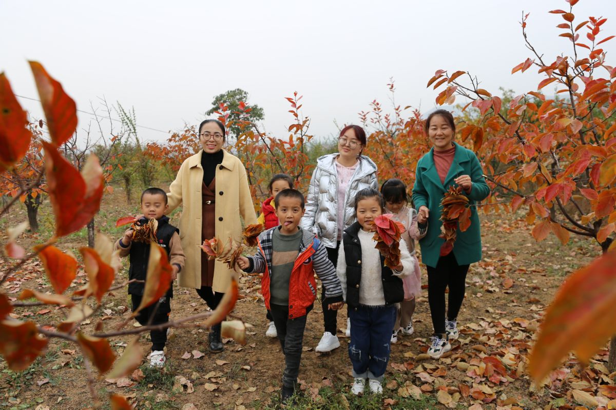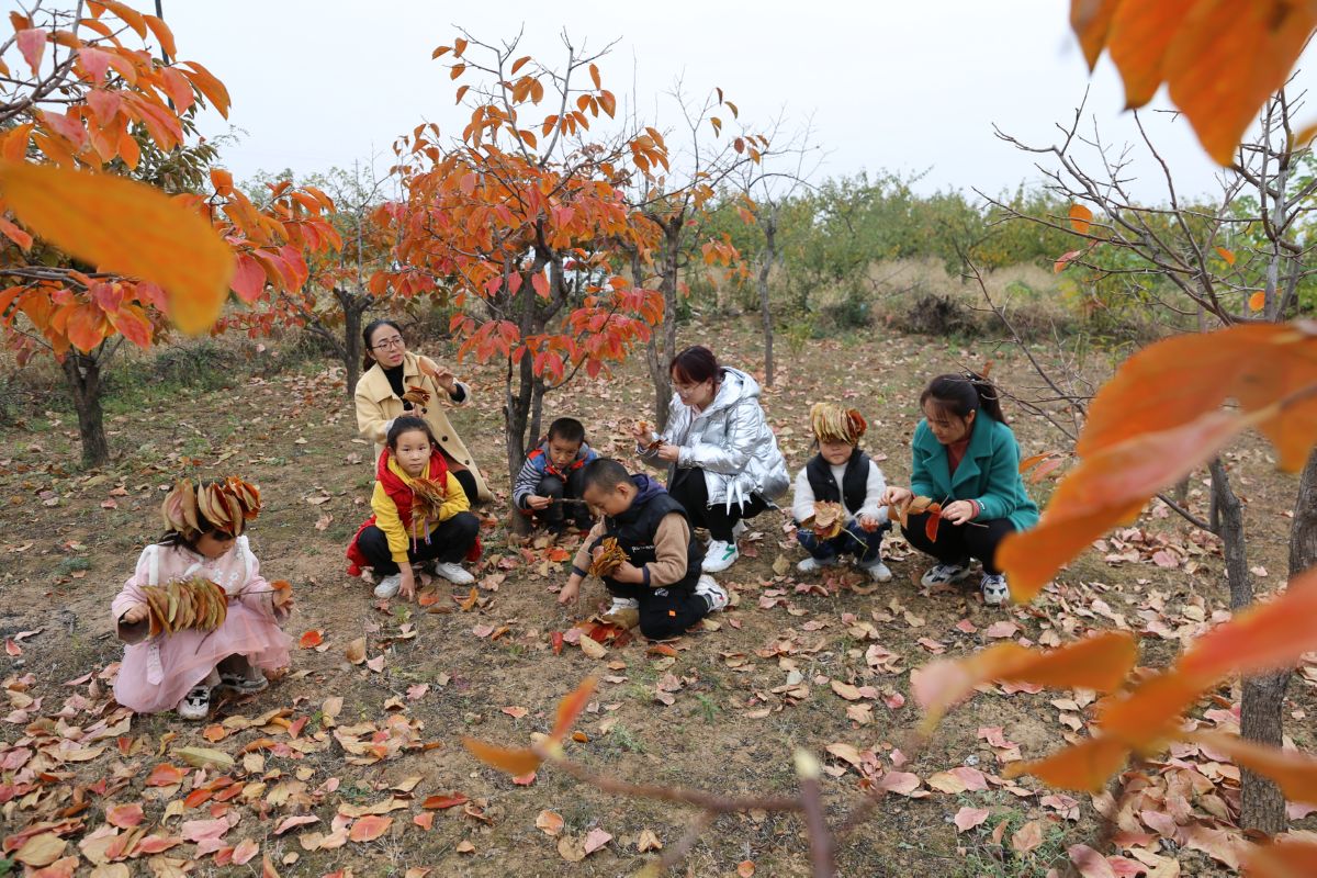 10月27日,夏縣瑤峰鎮城關中心校下渰底中心幼兒園老師,領著孩子們在附近山坡上穿柿葉。