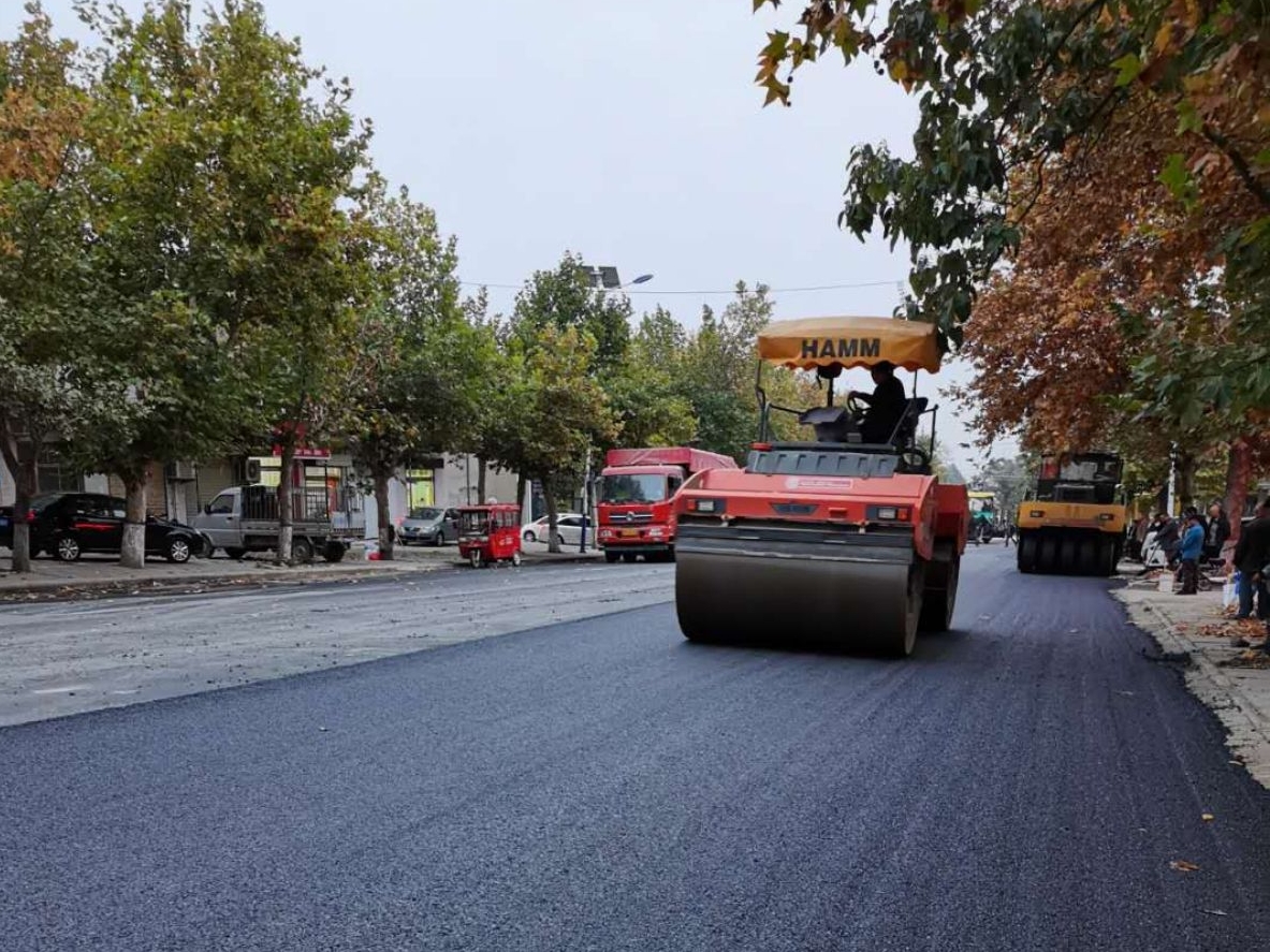 ▲近日,芮城縣大王鎮中心的南北大道改造提升工程加緊鋪油。