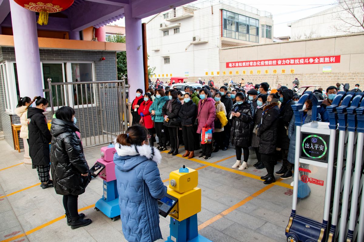 家長在新絳縣幼兒園排隊接孩子 特約攝影 宋 磊 攝