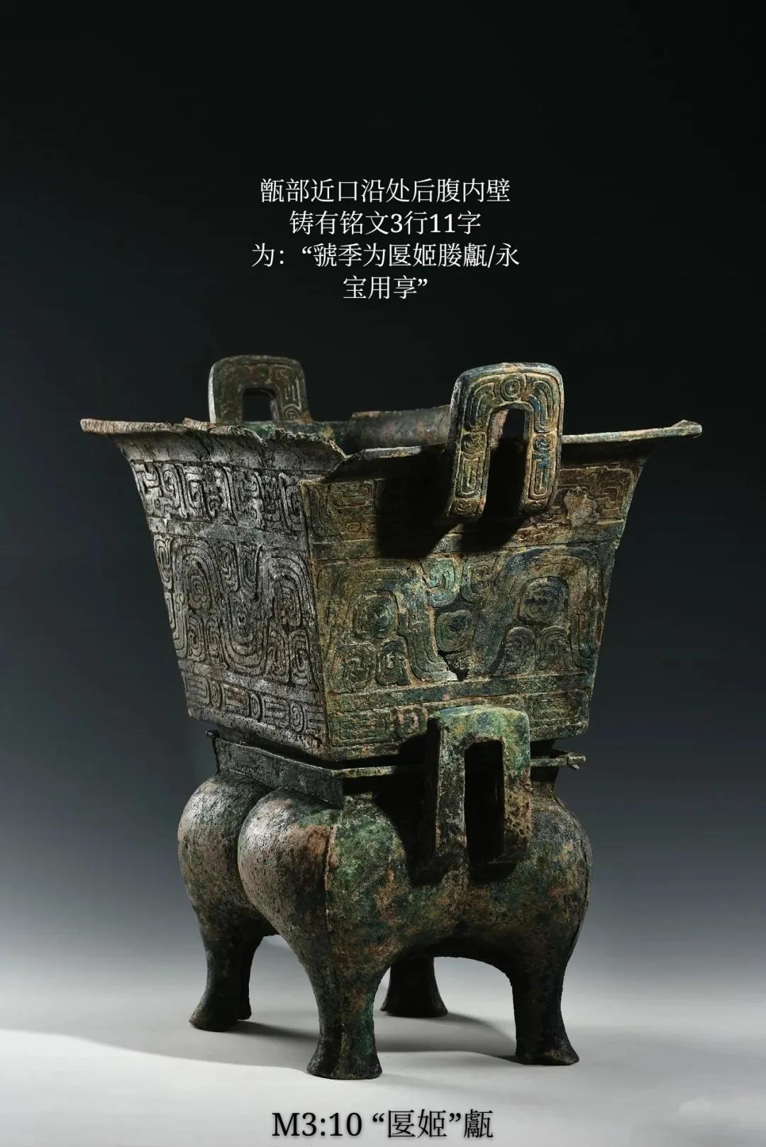 此次發掘的墓葬級別高、規模大,出土器物種類豐富,包括銅、玉、石、漆、陶、骨、蚌貝、鉛、金等各類文物總計500余件套。其中,禮器類有鼎、甗、簋、盨、鋪、罐等,禮樂器有編鐘和石磬。最重要的收獲是發現帶有銘文的銅器近50件套,銘文內容豐富,文字清晰,計14篇。