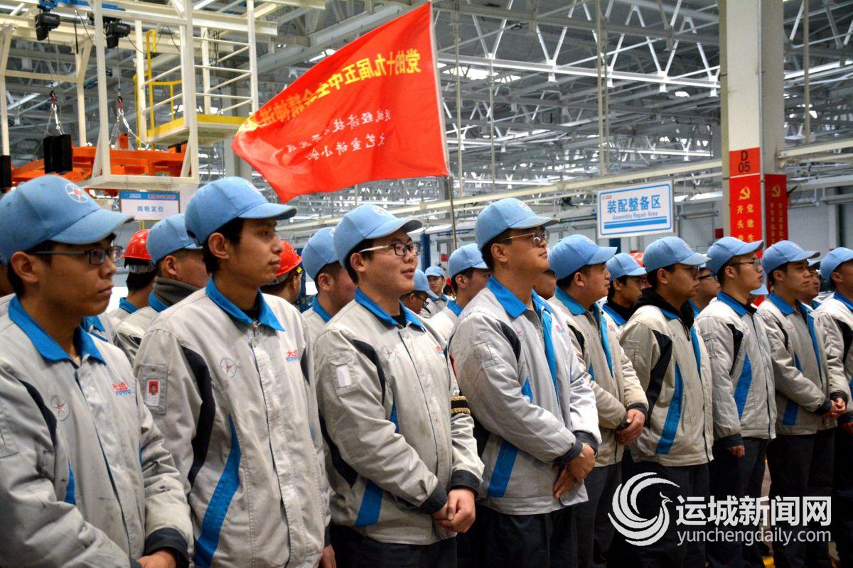 運城經開區黨工委書記、管委會主任王建軍與大運新能源汽車生產基地工人一起重溫入黨誓詞