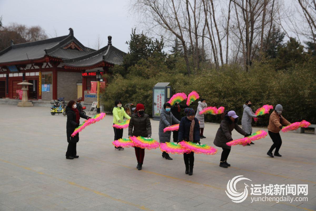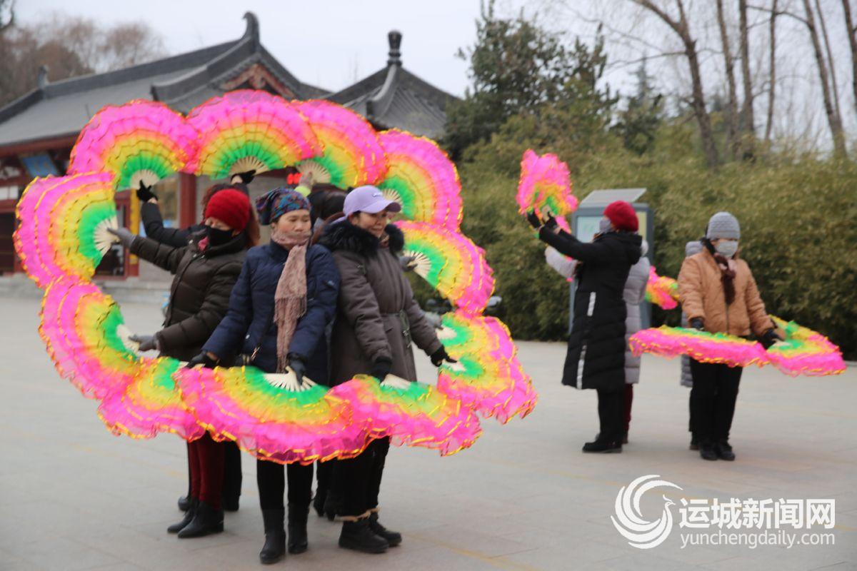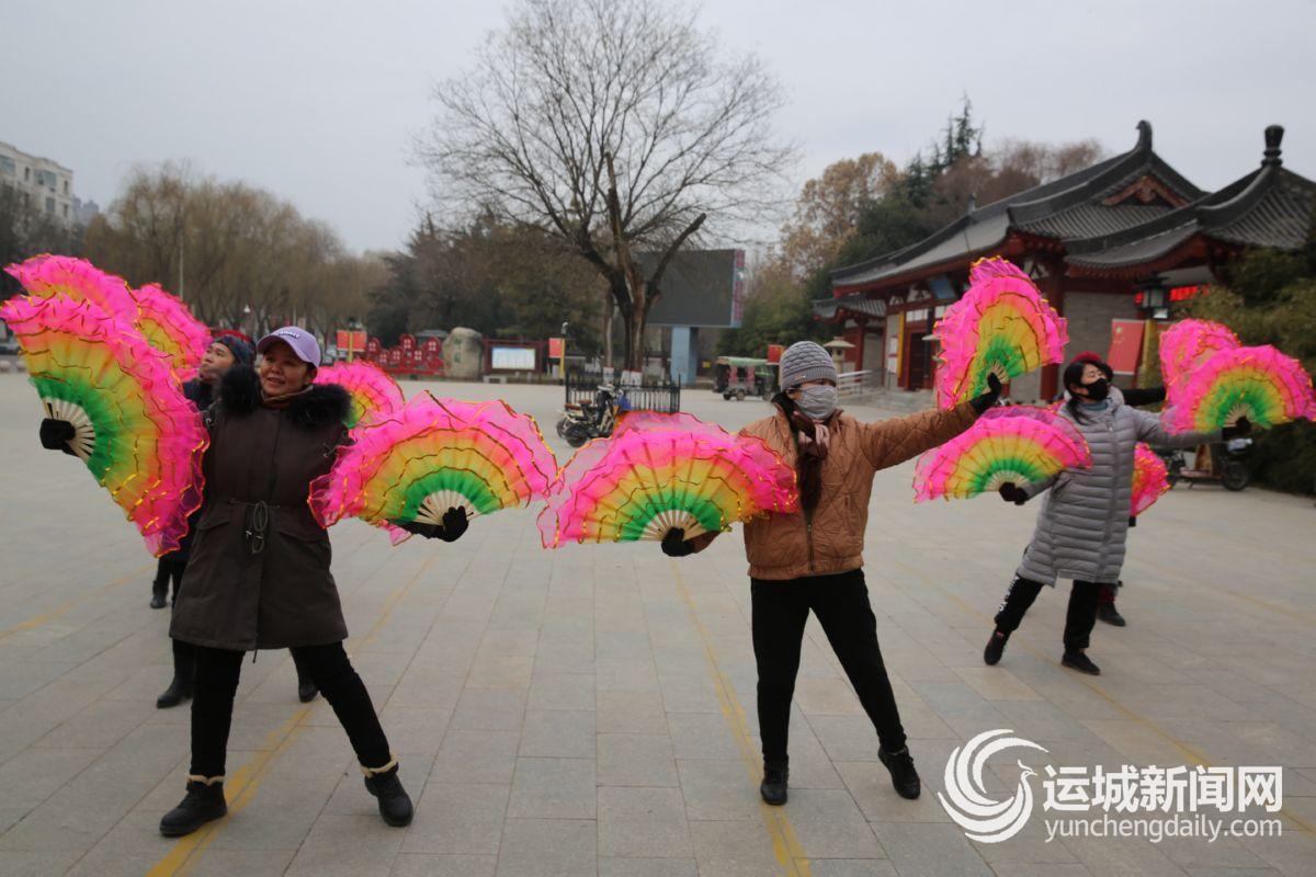 1月10日,在永濟(jì)市柳園東門前的小廣場上,該市的“柳絮飛揚”舞蹈隊隊員在練習(xí)扇子舞。