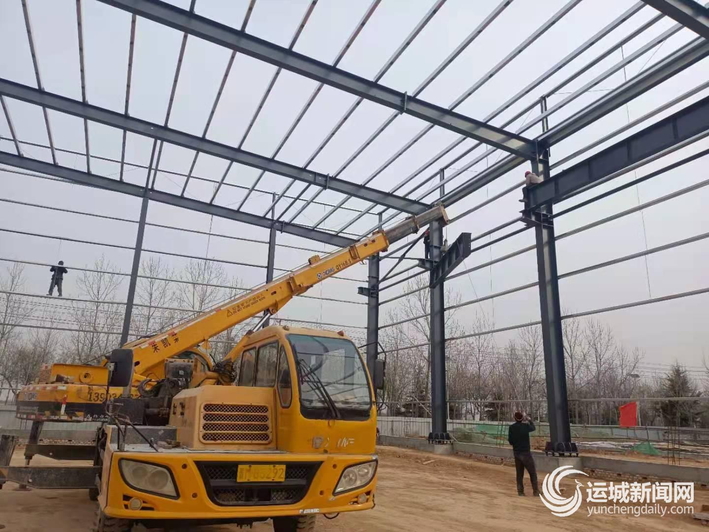 ▲2月4日,芮城縣新能源裝備制造產業園內,工人在吊裝軌道大梁,加快建設標準化廠房。