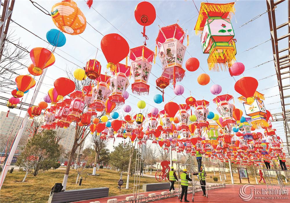 2月2日,聞喜縣人民廣場迎春燈盞正在布置