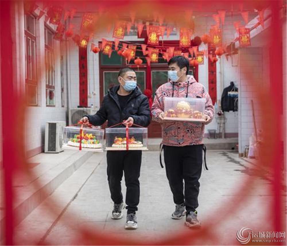 2月3日,芮城縣梅廚娘果蔬花饃公司員工為客戶送貨