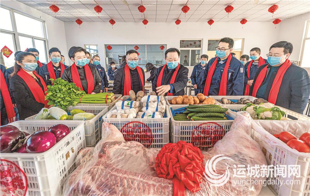 2月6日,運城經濟技術開發區為企業就地過年的外來務工人員,送來豬肉、蔬菜等年貨。