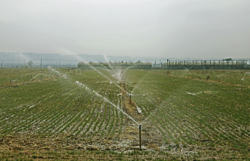 2月19日,在河津市陽村鄉黃河灘和平農場的麥田里,噴灌設施正在對小麥進行節水灌溉。
