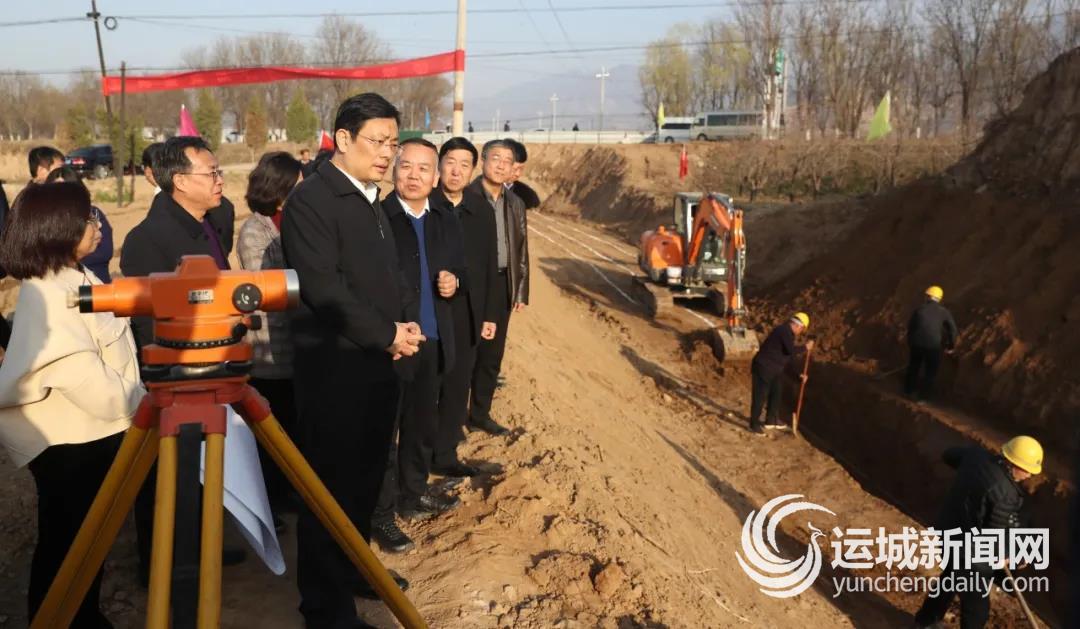 在位于蒲州鎮孟盟橋村的尊村引黃灌區姚溫片區水源置換工程建設現場,丁小強仔細察看施工圖,了解工程進度、預期效果、渠道沿線綠化等工作。他要求,要高標準建設引黃灌溉渠道,確保工程質量和施工安全,加強配水工作人員作風建設,讓黃河水惠及更多農民。