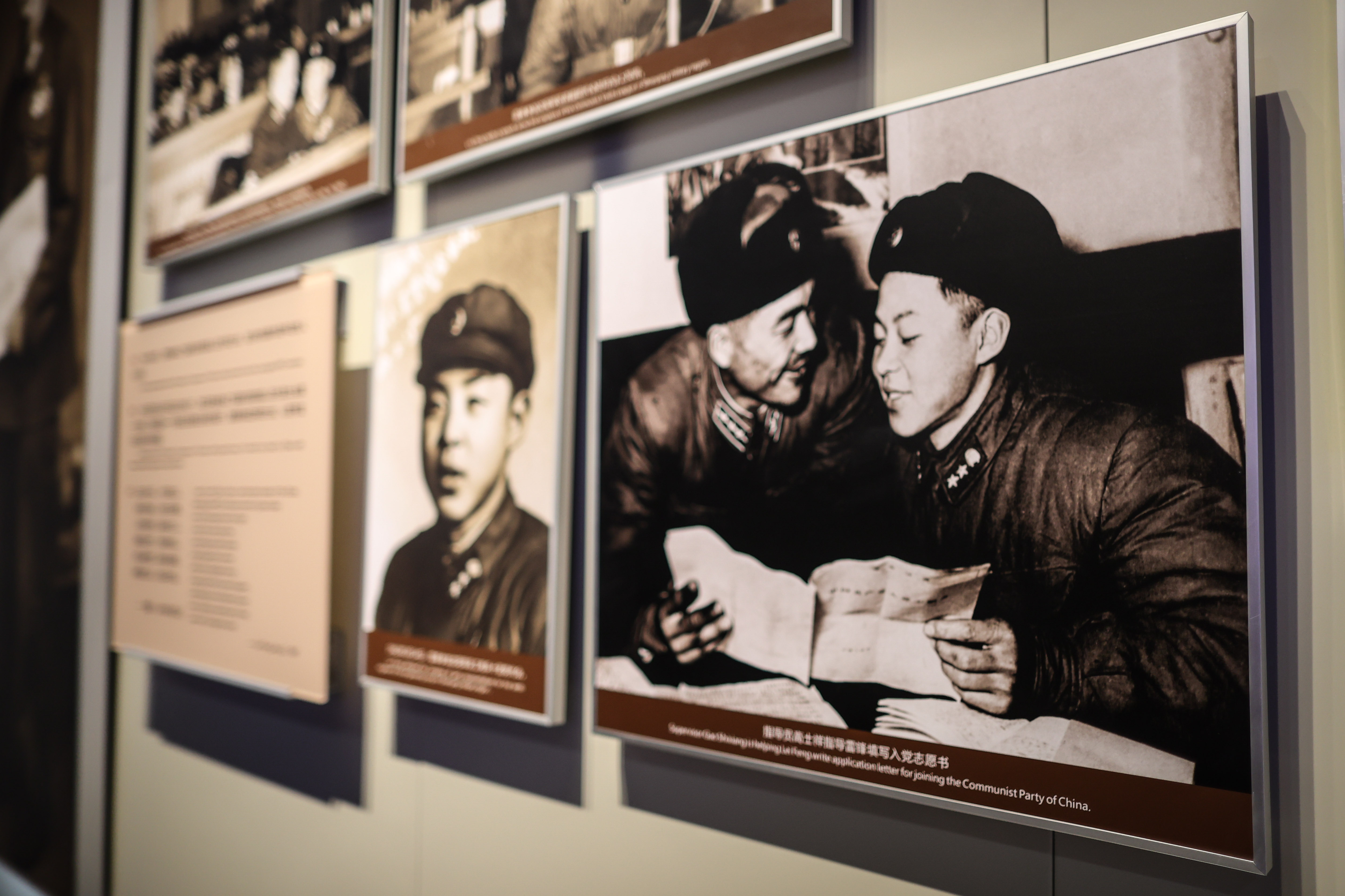 在13號車不遠處,有這樣一幅照片:雷鋒穿著整齊軍裝坐在案前,身旁的指導員高士祥側身望向他,兩人一起拿著一份中國共產黨入黨志愿書。