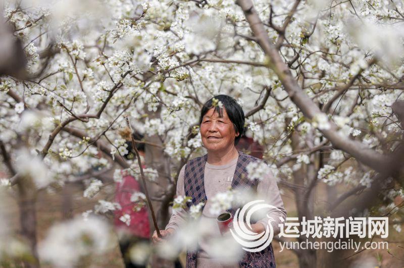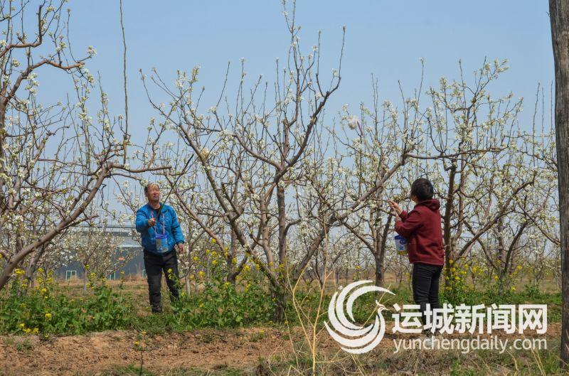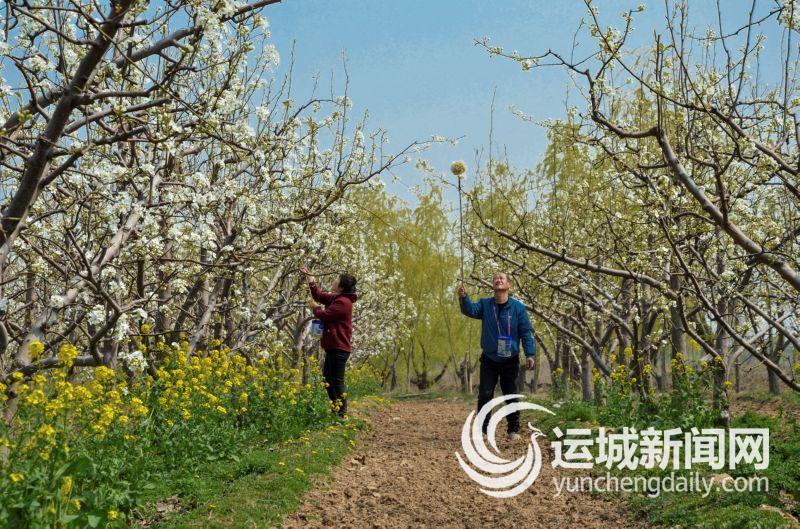 3月30日,稷山縣清河鎮(zhèn)薛村薛建峰家的3畝梨花盛開,工人們正忙著在梨園里授粉。 特約攝影 史云平