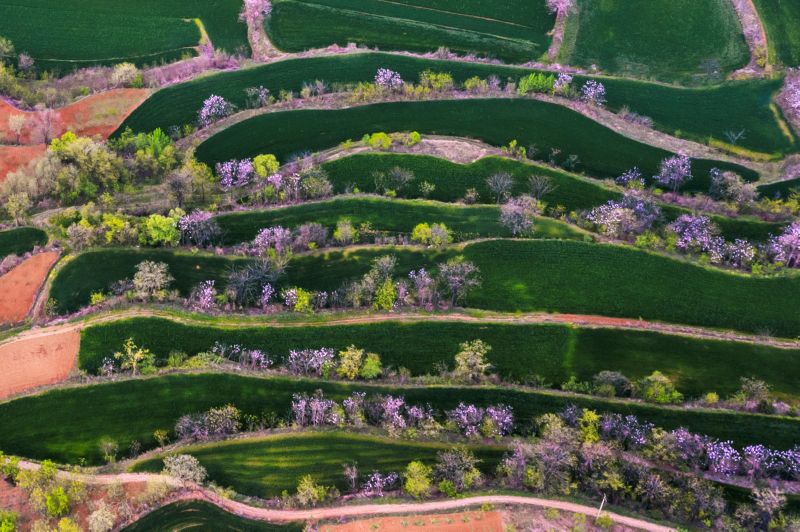 看那麥田碧綠好像海浪翻滾,泡桐花開又如紫衣飄飄,層層梯田形態多樣豐富,大路小道綿延通向村莊,溝溝壑壑讓人流連忘返。 郭改梅 攝