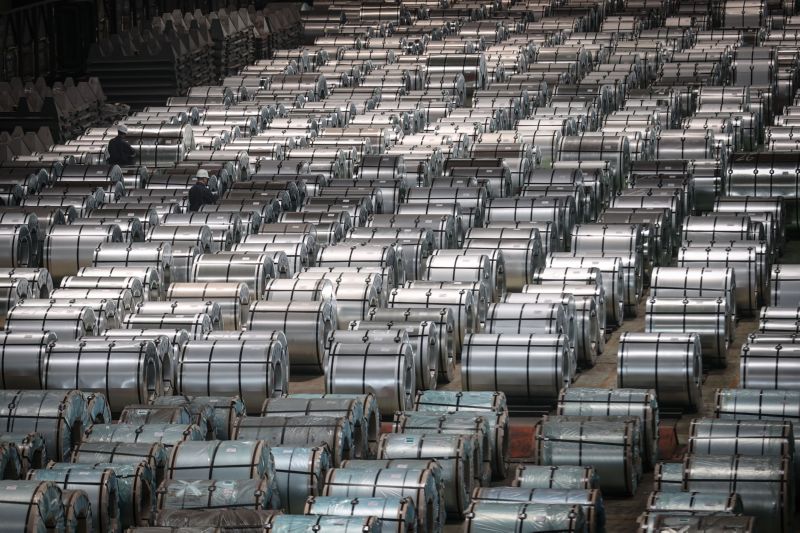 ▲工人在鞍鋼集團鞍鋼股份冷軋廠四、五號鍍鋅線鍍鋅板卷成品區檢查產品(4月20日攝)