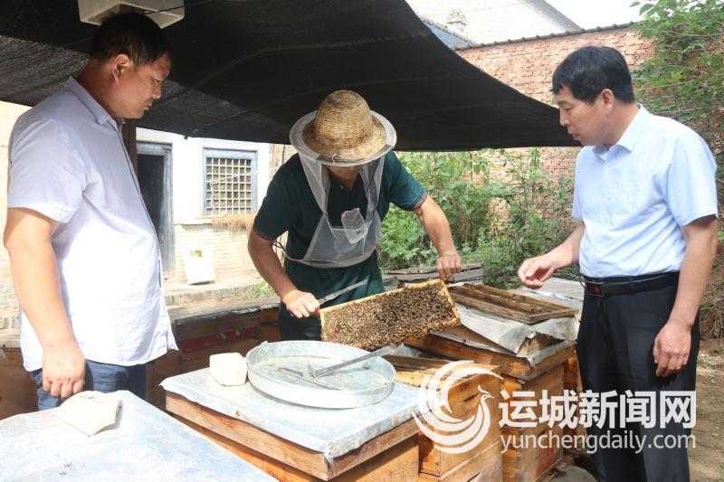 ▲6月20日,聞喜縣郭家莊鎮(zhèn)呂莊村退休職工王立虎(中)在與該縣中城社區(qū)黨支部書記王紅周(右)、呂莊村村委會主任李文科(左)一起交流養(yǎng)蜂技術(shù)。